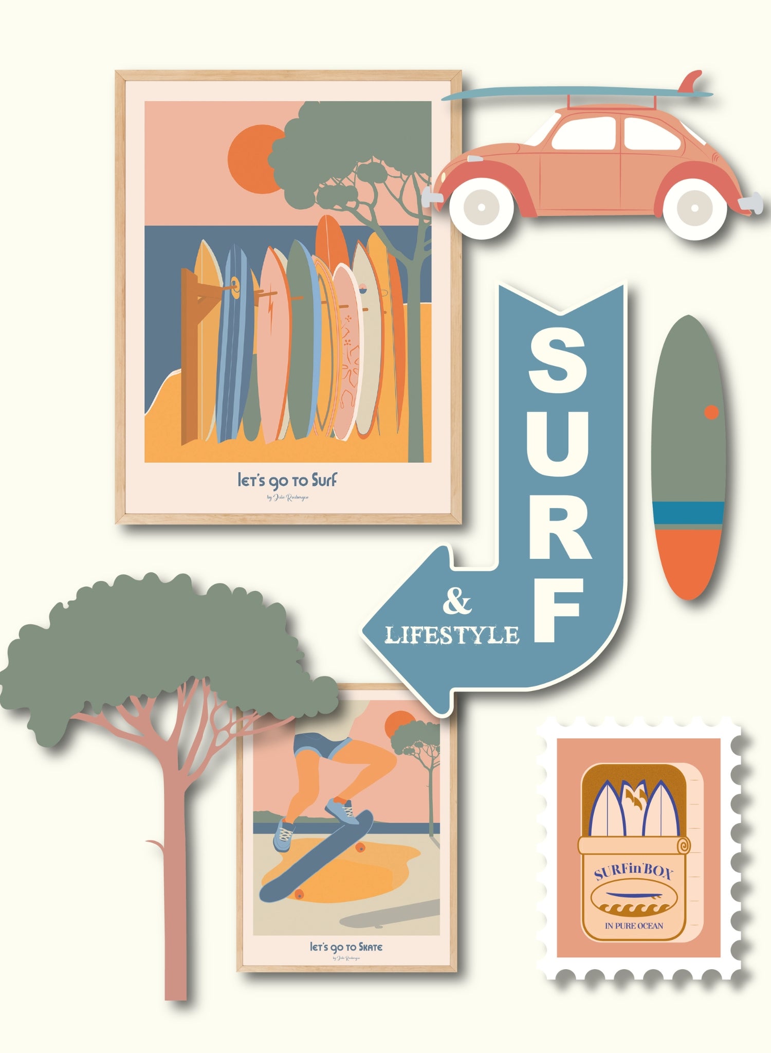 Vous trouverez dans mes collections aussi bien des affiches de villes emblématiques comme Quiberon, Toulouse ou Arcachon, que des créations plus lifestyle autour du surf, des fleurs ou de la vie quotidienne.