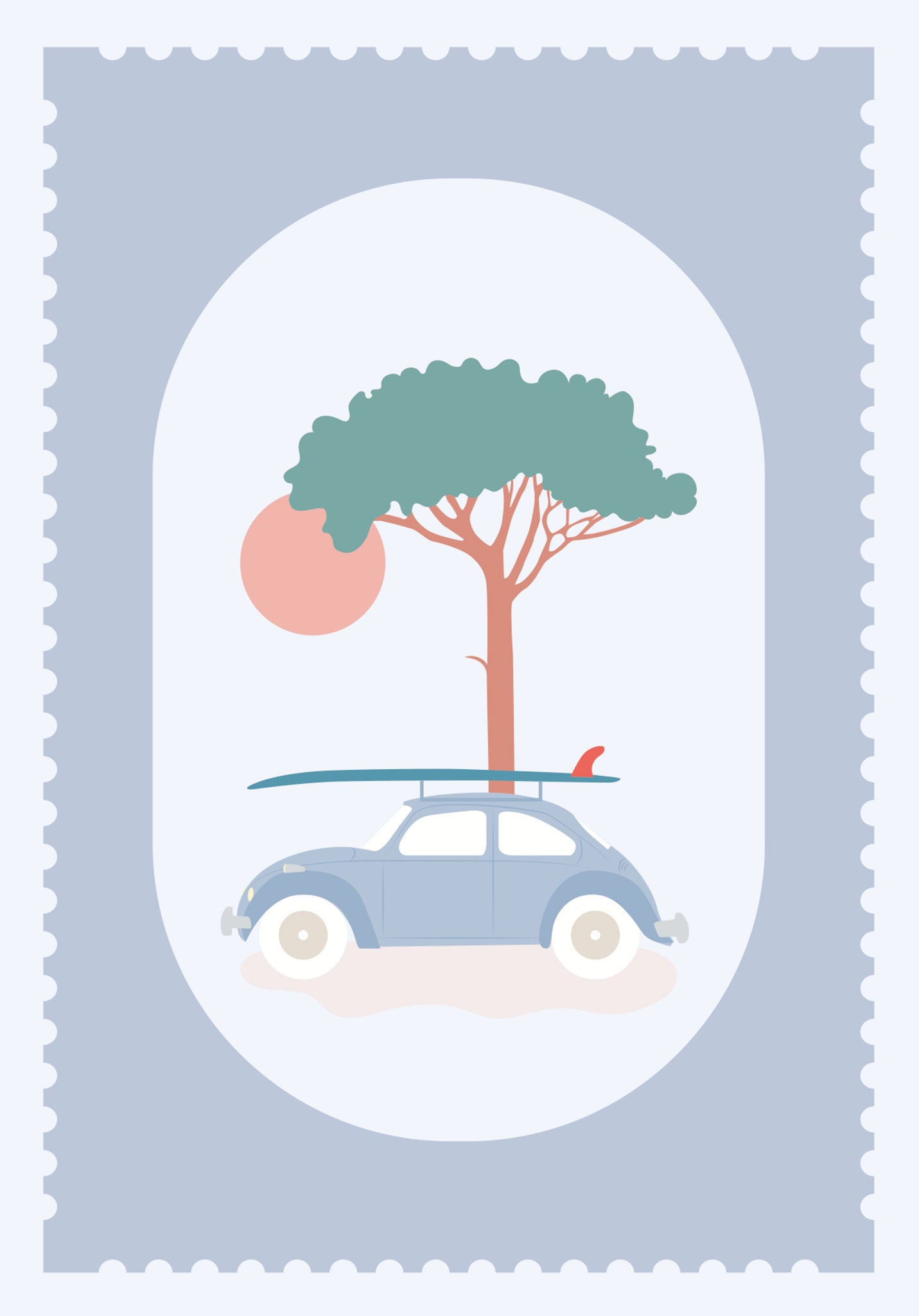 Une échappée belle entre dunes et surf “Pin, Surf & Coccinelle” illustre une scène rétro...