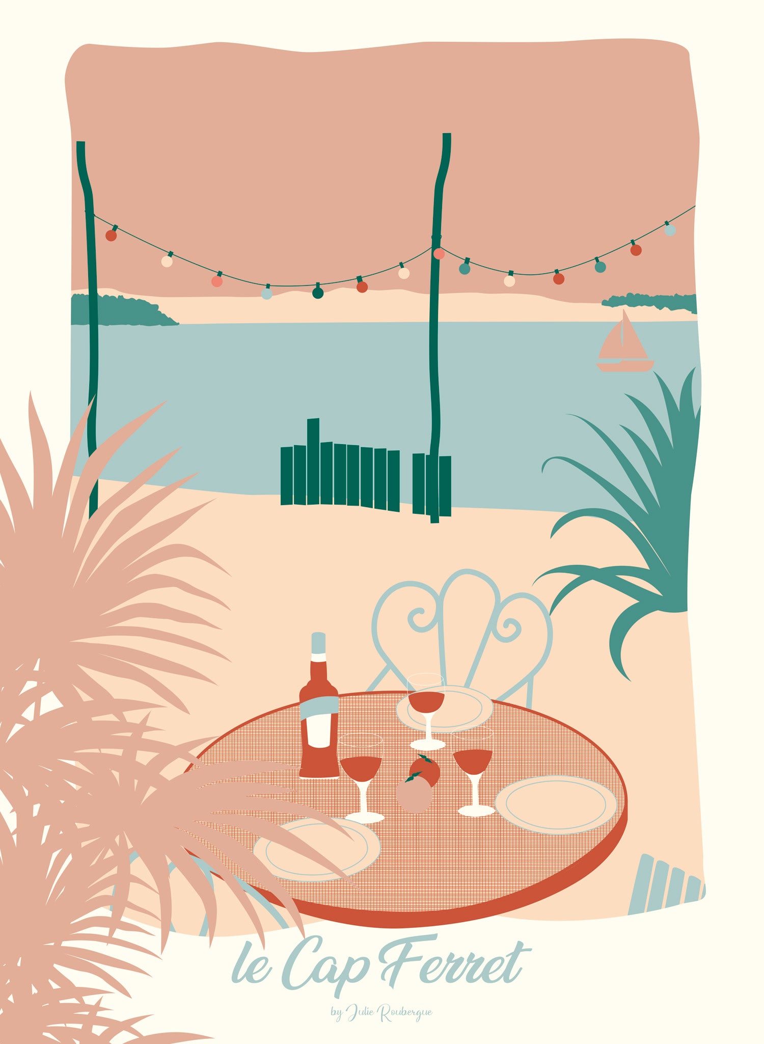 Chaque illustration capture un instant de vie sur le Bassin : l’ascension de la Dune du Pilat, les balades en pinasse vers le Cap Ferret, l’apéritif à l’Hôtel de la Plage, ou la découverte de la Ville d’Hiver d’Arcachon et de ses maisons Art Déco.